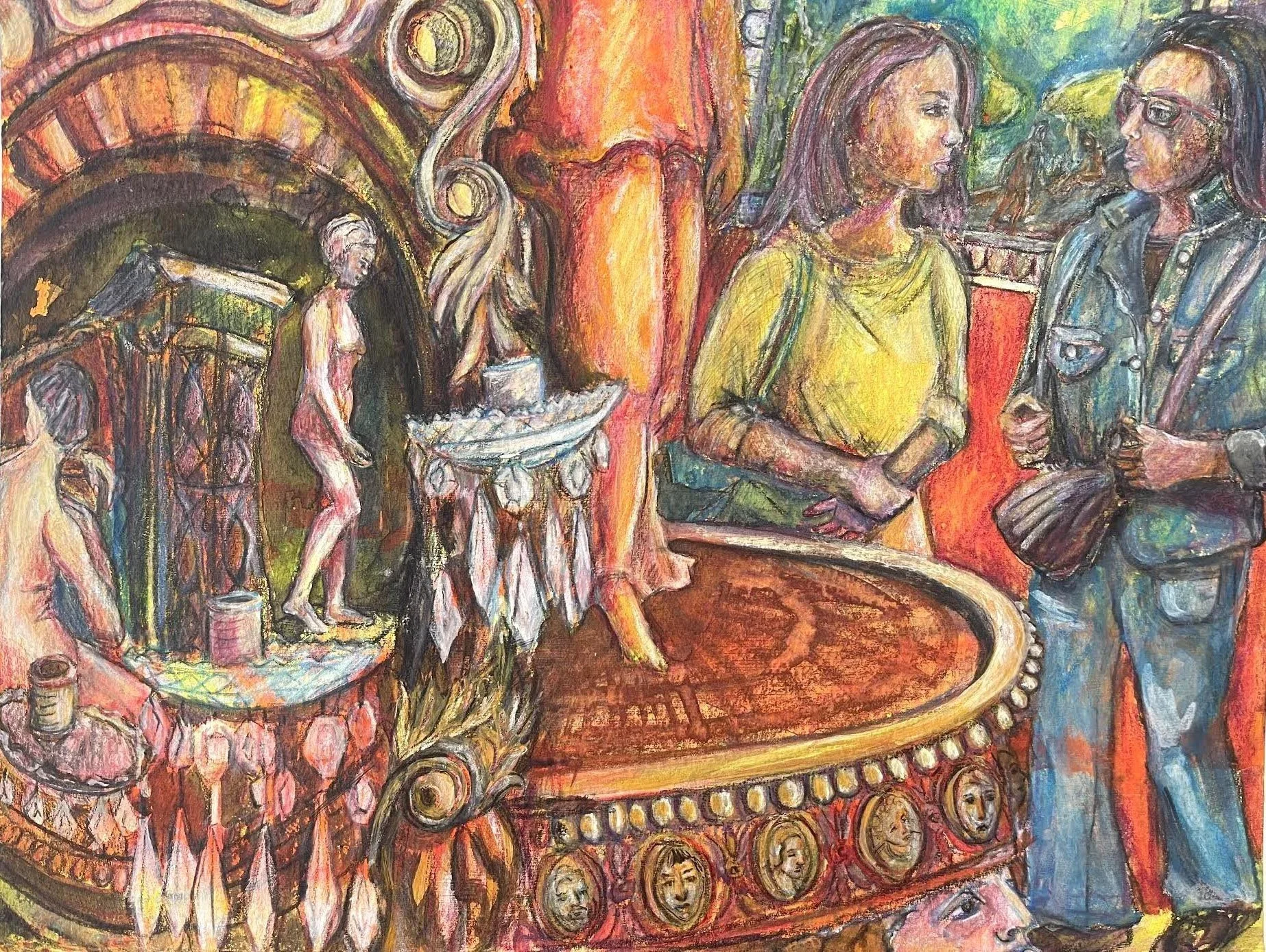 Telling Secrets, Fluid Acrylics, Ink, Watercolor, Pencil on Paper 9x12, 2023